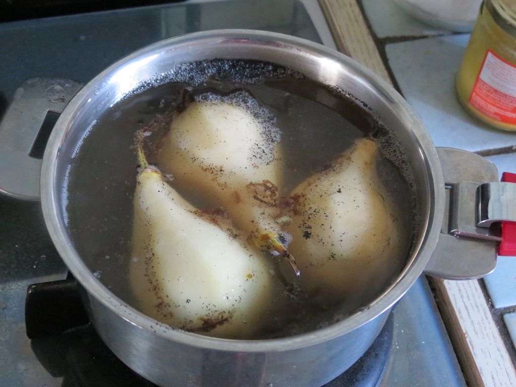 Peler les poires et les épépiner en les gardant entières (on utilisera un vide-pomme ou tout simplement un économe). Reporter le sirop à ébullition, y plonger les poires et laisser cuire en baissant le feu pendant 5 à 10 min. Cela va dépendre de la grosseur de vos poires. Vérifier la cuisson à l'aide d'une pique à brochette ou de la lame d'un couteau : les poires doivent être tendres.